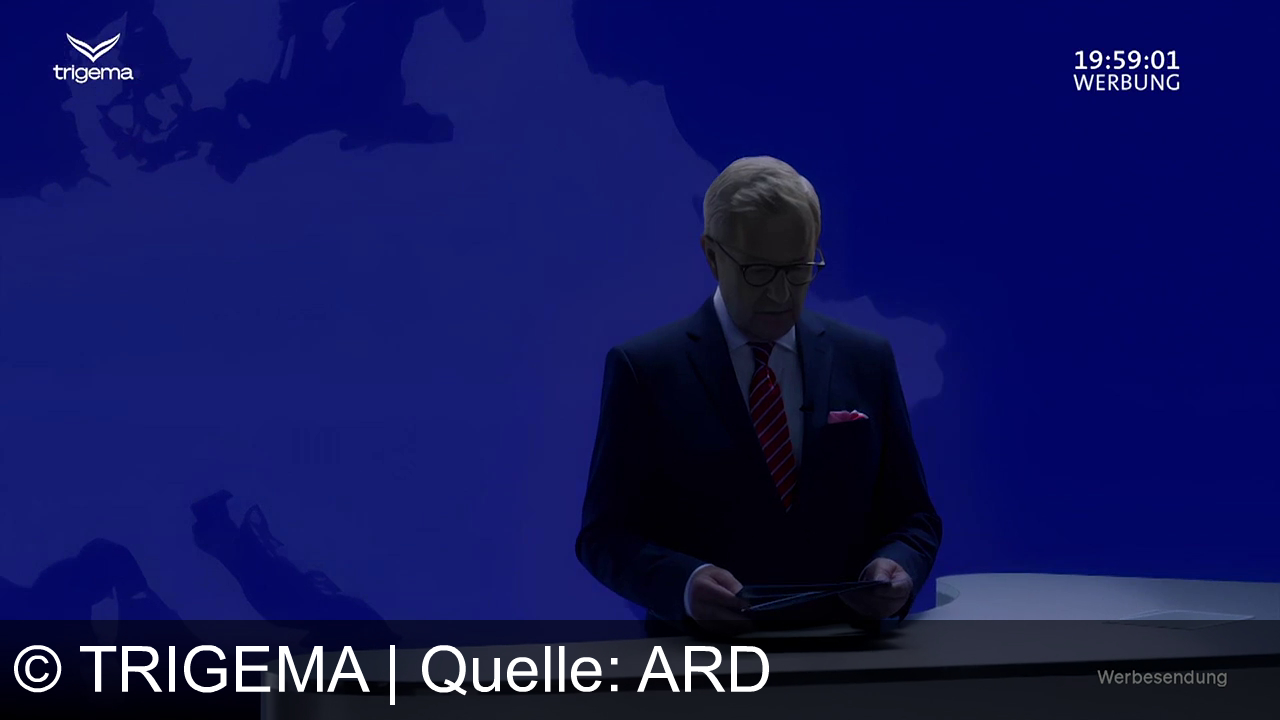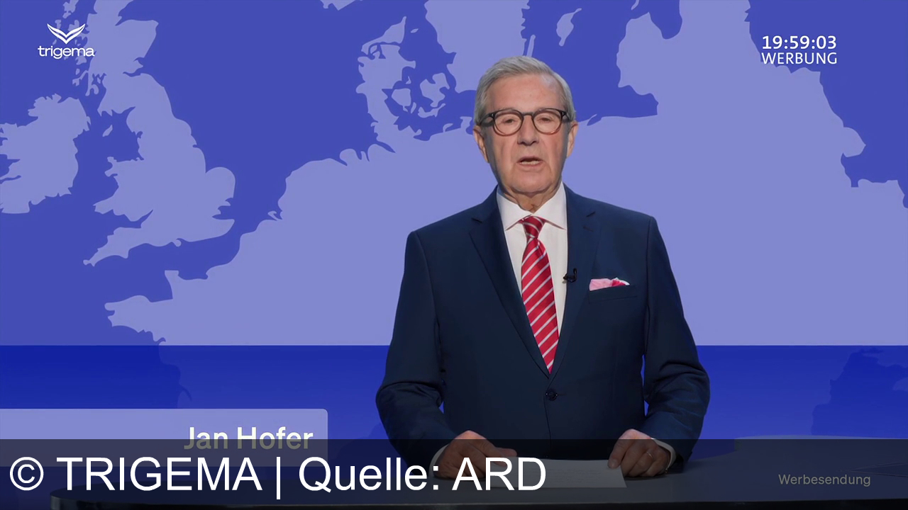 Ein Mann im Anzug steht vor einer Europakarte. Er trägt eine Brille und eine rot-weiß gestreifte Krawatte. Oben rechts steht die Zeit "19:59:03" und das Wort "WERBUNG". Links oben ist das Trigema-Logo zu sehen. In der unteren linken Ecke steht der Name "Jan Hofer". Unten rechts der Text "Werbesendung".
