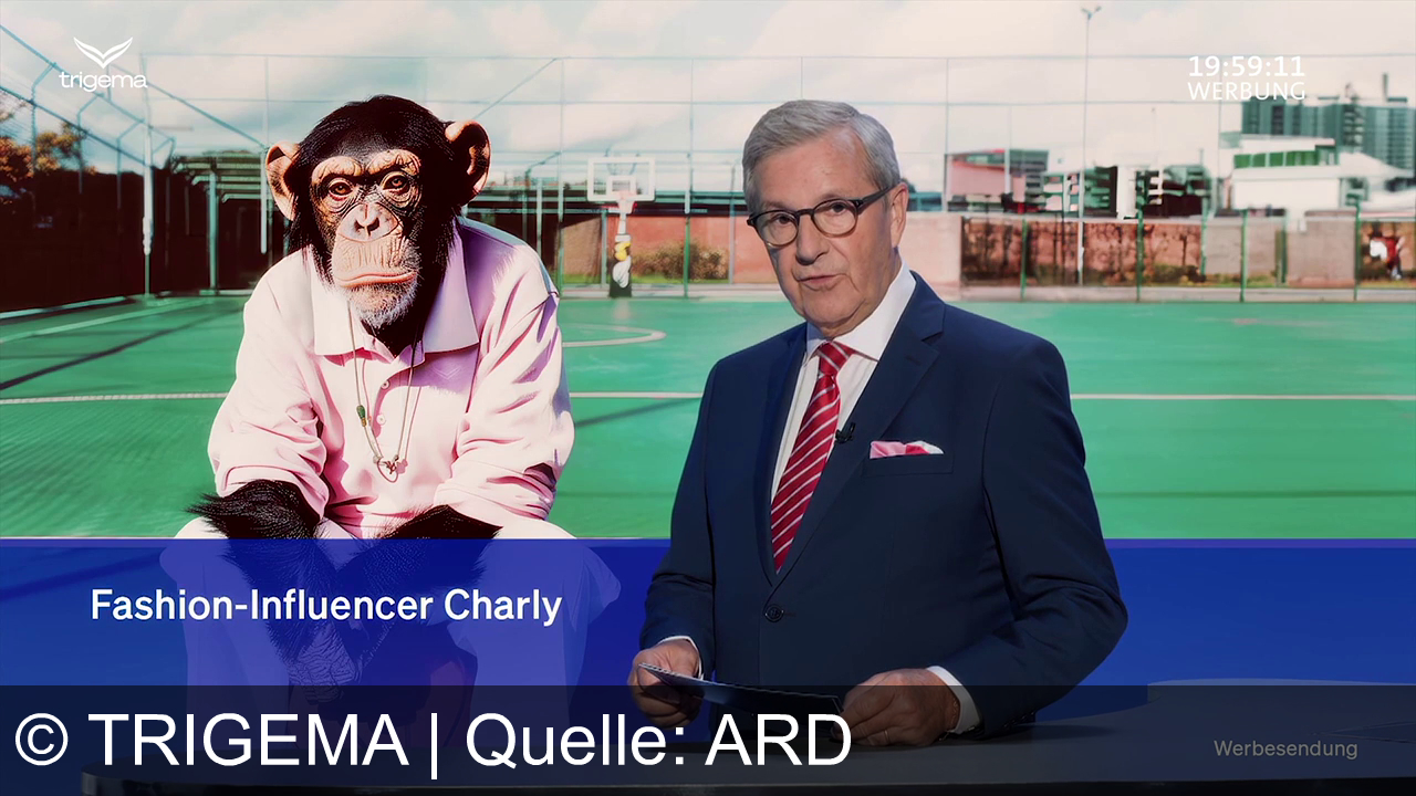 Ein Mann im Anzug steht an einem Tisch mit einem Bildschirm im Hintergrund. Auf dem Bildschirm ist ein Schimpanse in einem rosa Hemd zu sehen. Der Text "Fashion-Influencer Charly" ist eingeblendet. Rechts oben steht "Werbung" und eine Uhrzeit. Im Hintergrund befindet sich ein Basketballplatz.