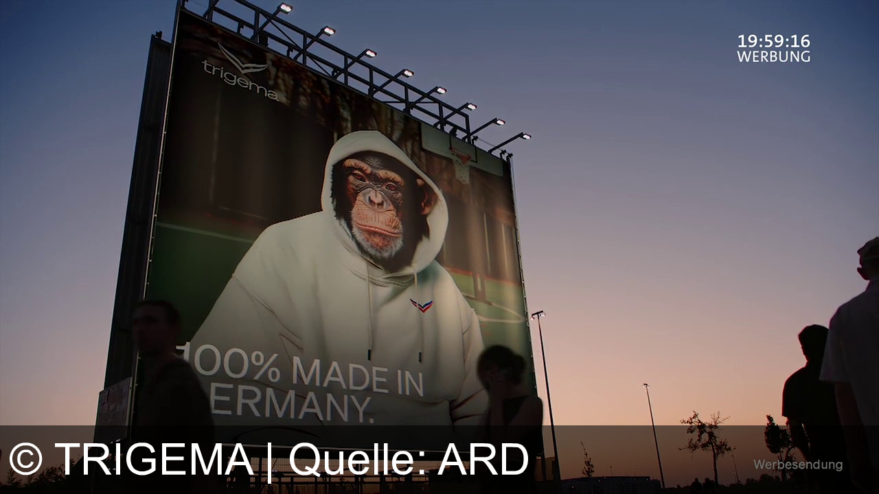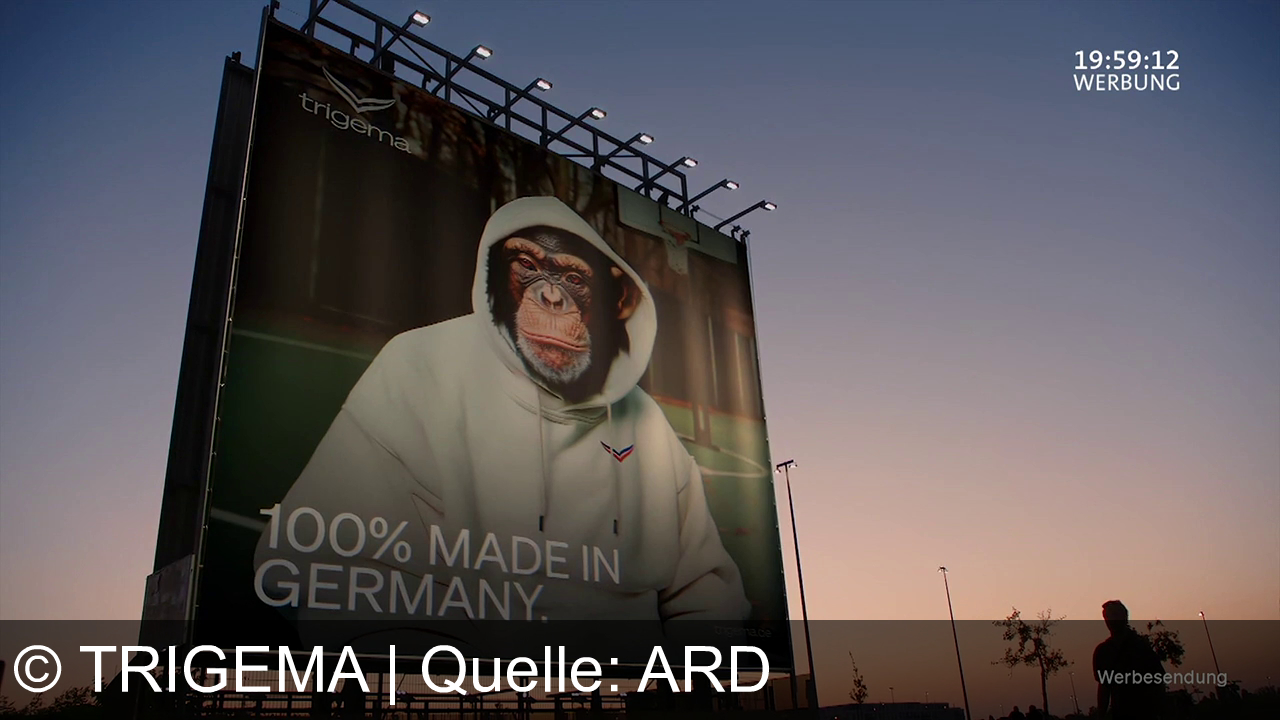 Ein riesiges Plakat zeigt einen Schimpansen in einem hellen Hoodie. Text: "100% MADE IN GERMANY". Darüber steht "trigema". Der Himmel ist im Sonnenuntergang, leichte Dämmerung. Rechts im Bild sieht man dunkle Silhouette einer Person. Uhrzeit: 19:59:12. Oben rechts und unten rechts steht "WERBUNG" und "Werbesendung".
