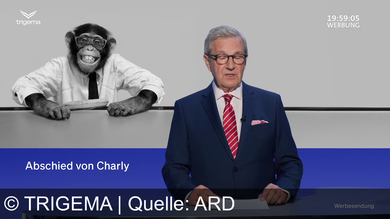 Ein älterer Herr im blauen Anzug mit roter Krawatte steht hinter einem Pult. Links im Bild ist ein Schimpanse im schwarz-weißen Anzug erkennbar. Oben links steht das Logo "trigema". Unten in der Mitte steht "Abschied von Charly". Oben rechts sind Uhrzeit und "WERBUNG" zu sehen.