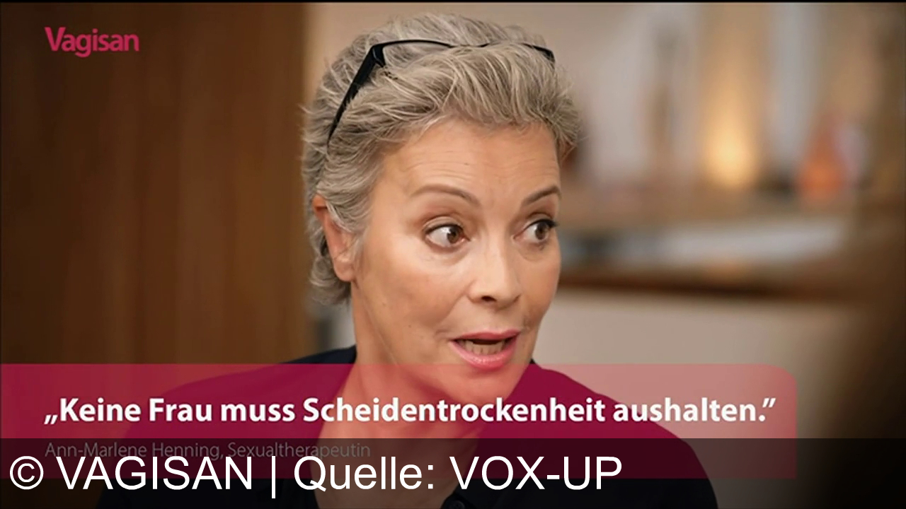 Eine Frau mit grauen Haaren und Brille auf dem Kopf spricht. Unten steht: „Keine Frau muss Scheidentrockenheit aushalten." Der Name Ann-Marlene Henning, Sexualtherapeutin, wird angezeigt. Oben links befindet sich das Logo "Vagisan". Hintergrund ist unscharf.