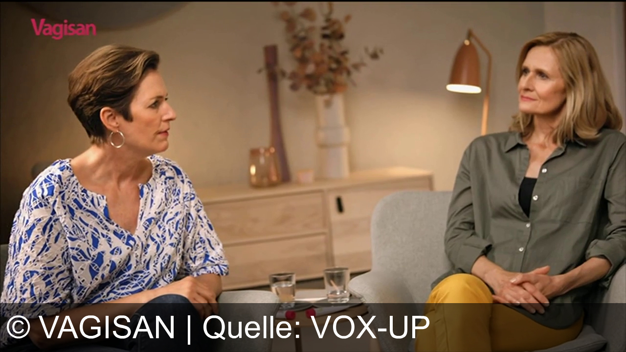 Zwei Frauen sitzen sich gegenüber. Die Frau links hat blonde Haare und trägt ein graues Hemd. Im Hintergrund leuchtet eine Lampe. Oben links steht der Schriftzug "Vagisan". Sie scheinen in einem Gespräch vertieft zu sein.