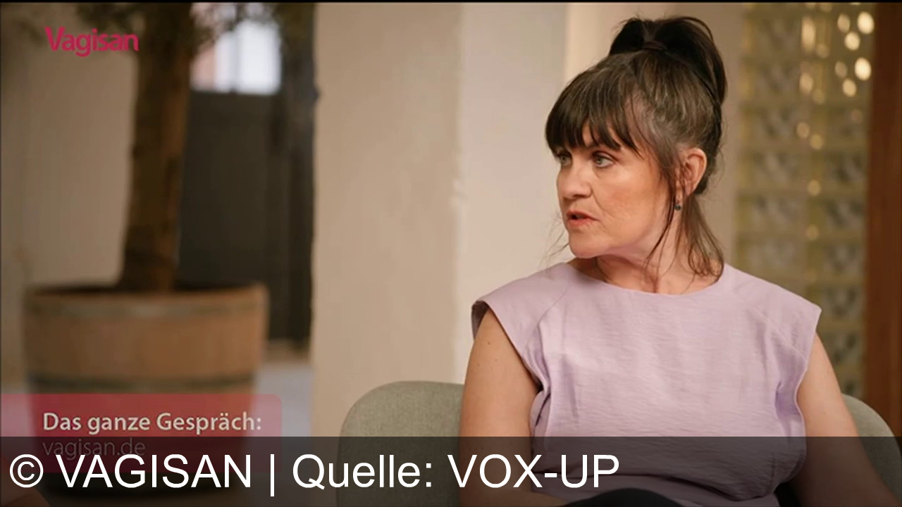 Eine Frau mit dunklen Haaren sitzt auf einem Sessel und blickt seitlich. Sie trägt ein lila Oberteil. Im Hintergrund steht ein großer Pflanzenkübel. Unten links befindet sich ein Textelement: „Das ganze Gespräch: vagisan.de“.