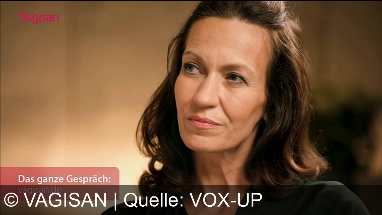 Eine Frau mit mittellangem braunem Haar und einem nachdenklichen Gesichtsausdruck. Der Hintergrund ist beige. In der linken unteren Ecke steht "Das ganze Gespräch: vagisan.de" in einem rosa Feld. Oben links ist der Schriftzug "Vagisan" in Pink zu sehen.