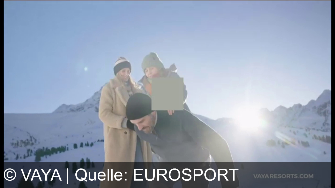 Eine Familie in Winterkleidung in verschneiten Bergen. Ein Mann kniet, während ein Kind auf seinem Rücken sitzt. Eine Frau steht neben ihnen. Die Sonne scheint hell im Hintergrund. Webadresse „vayaresorts.com“ unten rechts zu sehen.