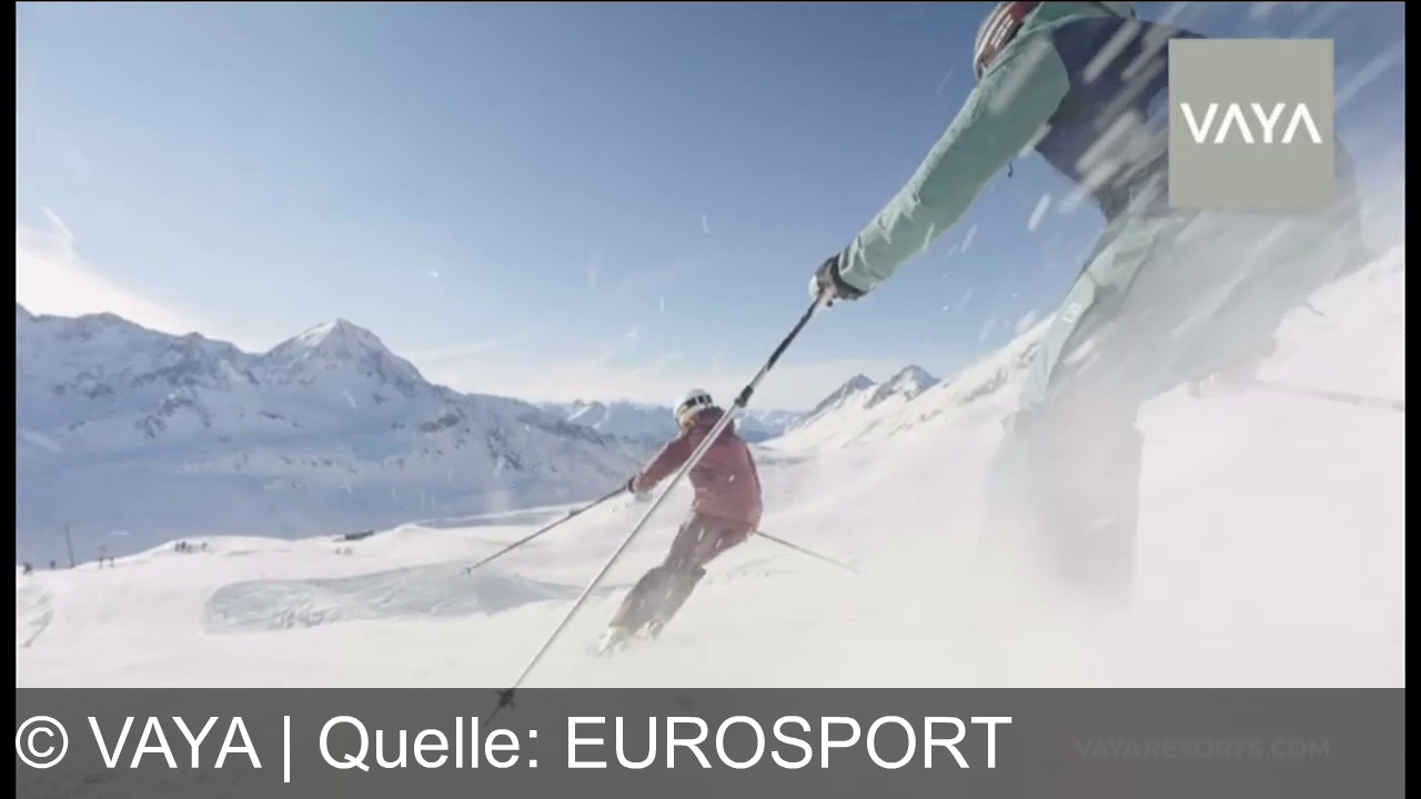 Zwei Personen fahren auf Skiern einen schneebedeckten Hang hinunter. Der Himmel ist klar und blau. Im Hintergrund sind schneebedeckte Berge zu sehen. Unten rechts steht "vayaresorts.com", oben rechts das Logo "VAYA". Eine Person trägt rote Kleidung, die andere helle Kleidung.