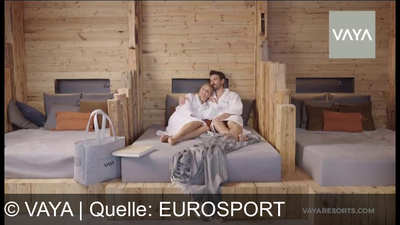 Ein Paar sitzt in weißen Bademänteln auf einem großen Bett in einem Raum mit Holzverkleidung. Neben dem Paar liegen eine graue Decke und ein Kissen. Links von ihnen steht eine graue Tasche mit der Aufschrift "VAYA". Rechts oben im Bild ist ein Logo mit "VAYA". Es gibt mehrere Kissen in verschiedenen Farben auf den Betten. Links und rechts vom Bett gibt es weitere Liegen.