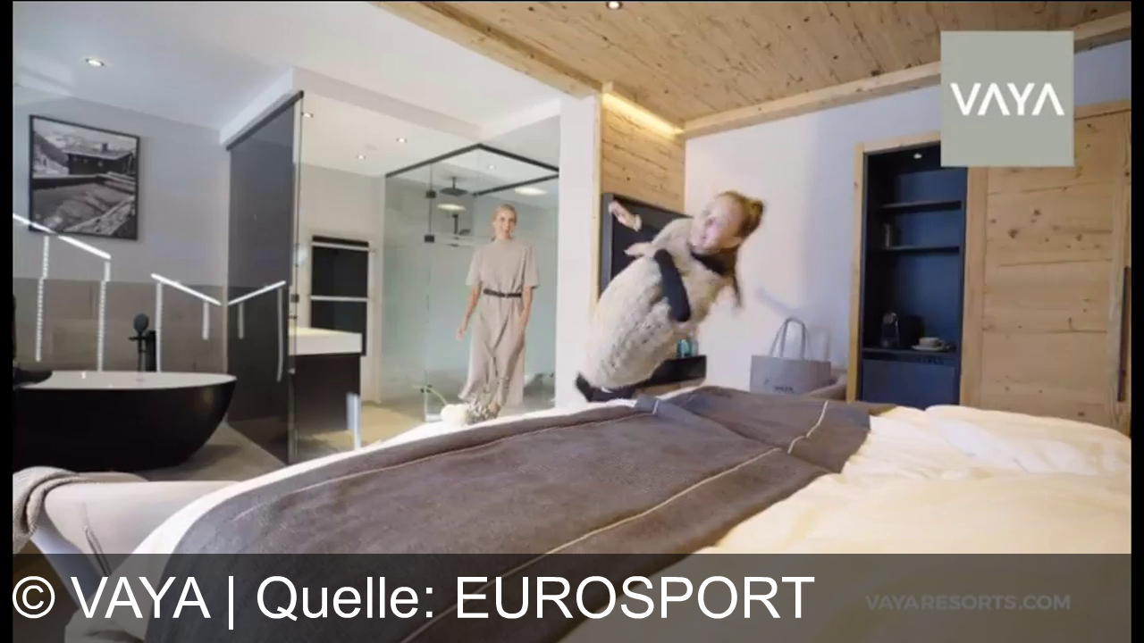 Eine Person springt auf ein Bett in einem modern eingerichteten Hotelzimmer. Im Hintergrund steht eine andere Person in einem beigen Outfit. Die Wand besteht aus hellem Holz, links ist ein Badezimmer mit Badewanne und Glasdusche. Auf dem Bett liegt eine Decke, daneben eine Tasche. Oben rechts steht „VAYA“.