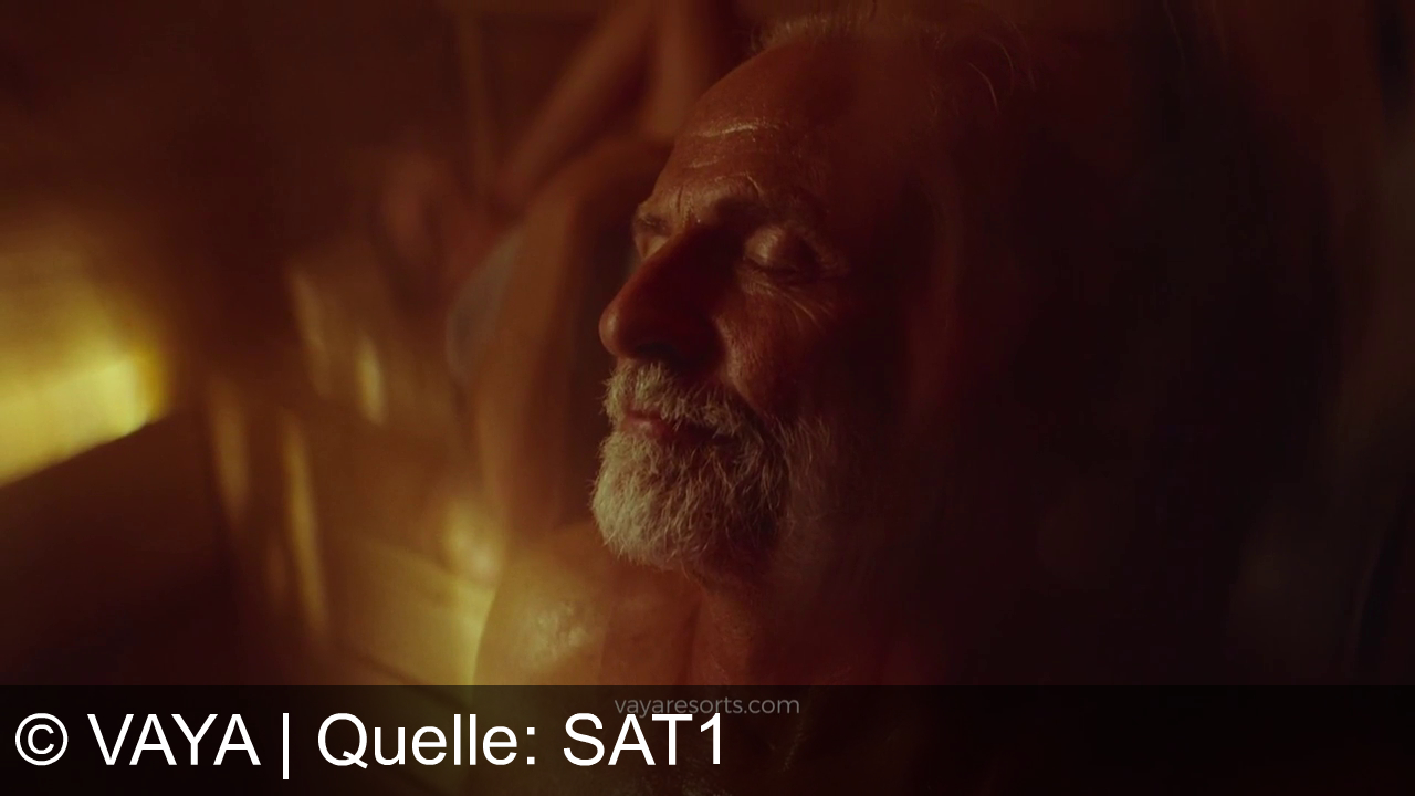 Ein älterer Mann sitzt oberkörperfrei in einer Sauna, hat die Augen zu und ist verschwitzt. Warmes Licht fällt auf sein Gesicht. Im Hintergrund sitzt eine weitere Person auf der Bank. Auf dem Bild steht die Webadresse vayaresorts.com.