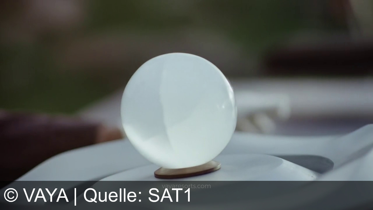 Eine weiße Kugel steht auf einem kleinen Sockel, davor liegt glatter Stoff. Unten im Bild steht die Webadresse vayaresorts.com. Hinter der Kugel ist alles unscharf.