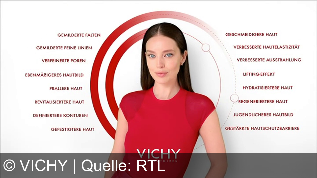 Eine Frau trägt ein rotes Oberteil. Schriftzüge umgeben sie: "Gemilderte Falten", "Verfeinerte Poren", "Geschmeidigere Haut" und mehr. Hinter ihr sind rote Kreise. Unten steht "VICHY LABORATOIRES".