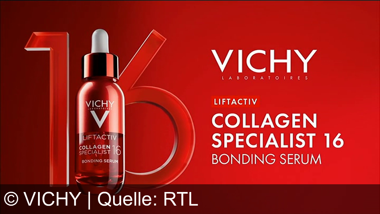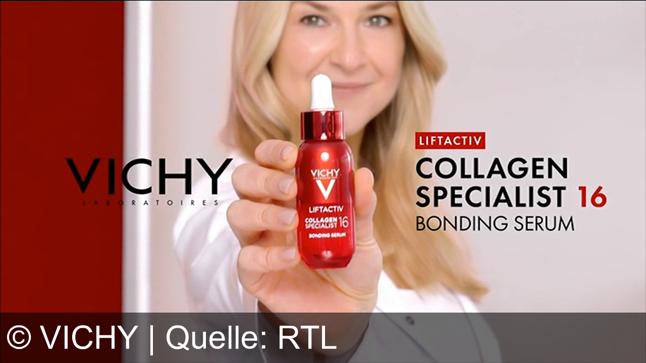Ein roter Hintergrund mit einer großen 16. Links eine Flasche mit Serum, darauf steht "Vichy Liftactiv Collagen Specialist 16 Bonding Serum." Rechts der Text "Vichy Laboratoires, Liftactiv Collagen Specialist 16 Bonding Serum."