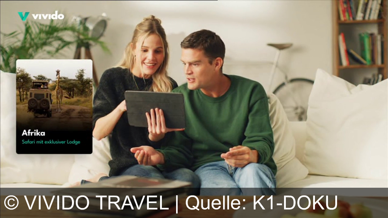 Ein Mann und eine Frau sitzen auf einem Sofa und schauen auf ein Tablet. Der Mann trägt einen grünen Pullover, die Frau einen dunklen. Im Hintergrund sind Pflanzen, ein Fahrrad und ein Bücherregal zu sehen. Links oben: Logo "vivido". Links: Ein Bild mit Aufschrift "Afrika Safari mit exklusiver Lodge". Auf dem Tisch liegen Zeitschriften, daneben eine Schale mit Äpfeln.