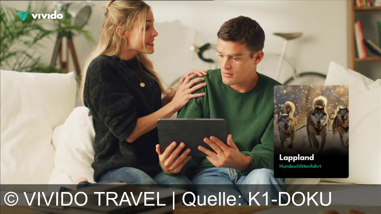 Ein Mann und eine Frau sitzen auf einem Sofa. Der Mann hält ein Tablet. Die Frau berührt seine Schulter und spricht zu ihm. Rechts unten sieht man ein Bild mit Huskys im Schnee und dem Text "Lappland Hundeschlittenfahrt". Im Hintergrund sind Pflanzen und ein Fahrrad. Links oben steht "vivido". Bücher liegen auf dem Tisch vor ihnen.