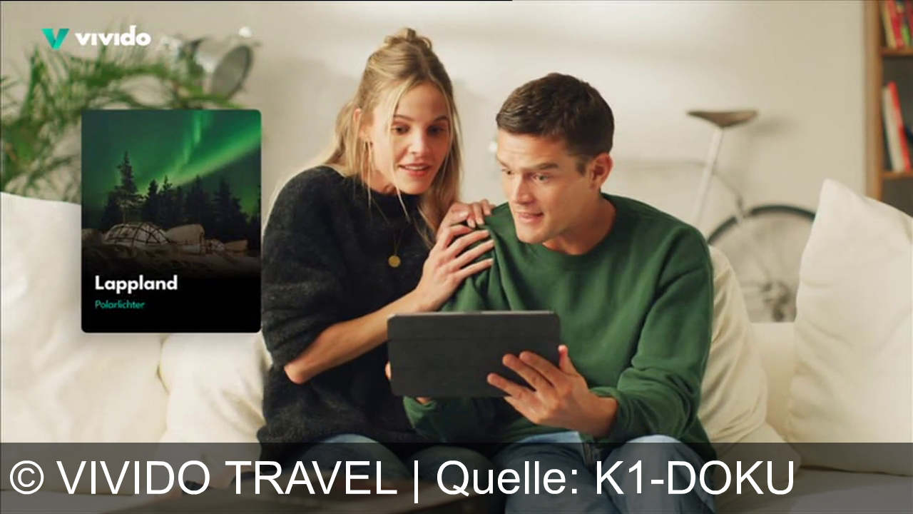 Ein Mann und eine Frau sitzen auf einem Sofa. Der Mann hält ein Tablet, beide schauen mit Interesse darauf. Links im Bild eine Einblendung mit "Lappland" und Bild von Polarlichtern. Im Hintergrund Pflanzen, ein Fahrrad und ein Bücherregal. Oben links das Logo "vivido".