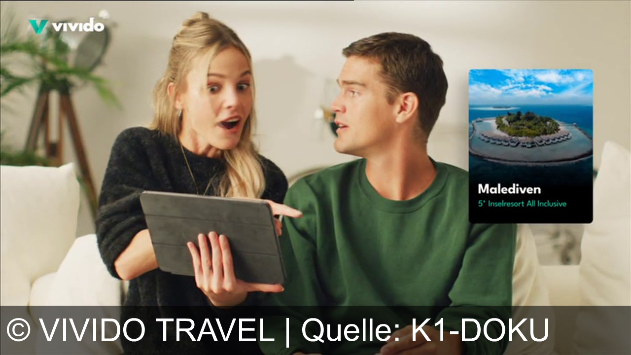 Ein Mann und eine Frau sitzen auf einem Sofa, sie hält ein Tablet. Beide sehen überrascht aus. Auf dem Tablet-Bildschirm ist ein Angebot für die Malediven zu sehen, mit dem Text "Malediven" und "5* Inselresort All Inclusive". Links oben steht "vivido". Im Hintergrund stehen Pflanzen und eine Lampe.