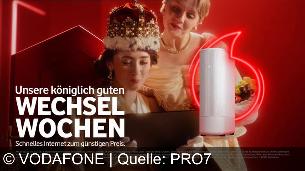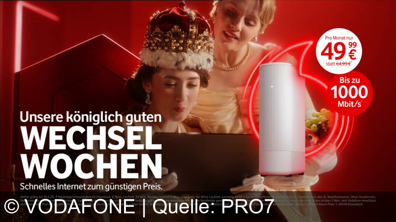 Vodafone bewirbt einen Internetanschluss mit bis zu 1000 Mbit/s für 49,99 Euro monatlich. Die Kampagne nutzt eine königliche Kulisse, um den Service zu betonen. Der Anbieter unterstützt aktiv beim Wechsel, übernimmt die Kündigung beim Altanbieter und erlässt bis zu zwölf Monate die Grundgebühr. Zentrale Botschaft ist der unkomplizierte Netzwechsel.