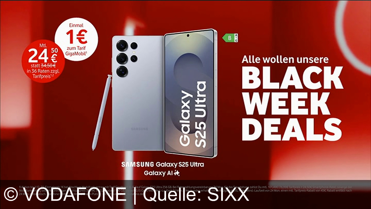 Werbung aus dem Jahr 2025 von Vodafone in Deutschland, mit dem von uns gewählten Titel: "Samsung Galaxy S25 Ultra für 1 € bei Vodafone – exklusive Black Week Top-Deals sichern" mit der Kurzbeschreibung: "Sichere dir das Samsung Galaxy S25 Ultra für nur 1 € und 24,50 €/Monat – exklusiv bei Vodafone Black Week Deals mit GigaMobil-Tarif!". Diese Werbung thematisiert oder beinhaltet die Kategorie/n Handy-Smartphone, Mobilfunkvertrag.