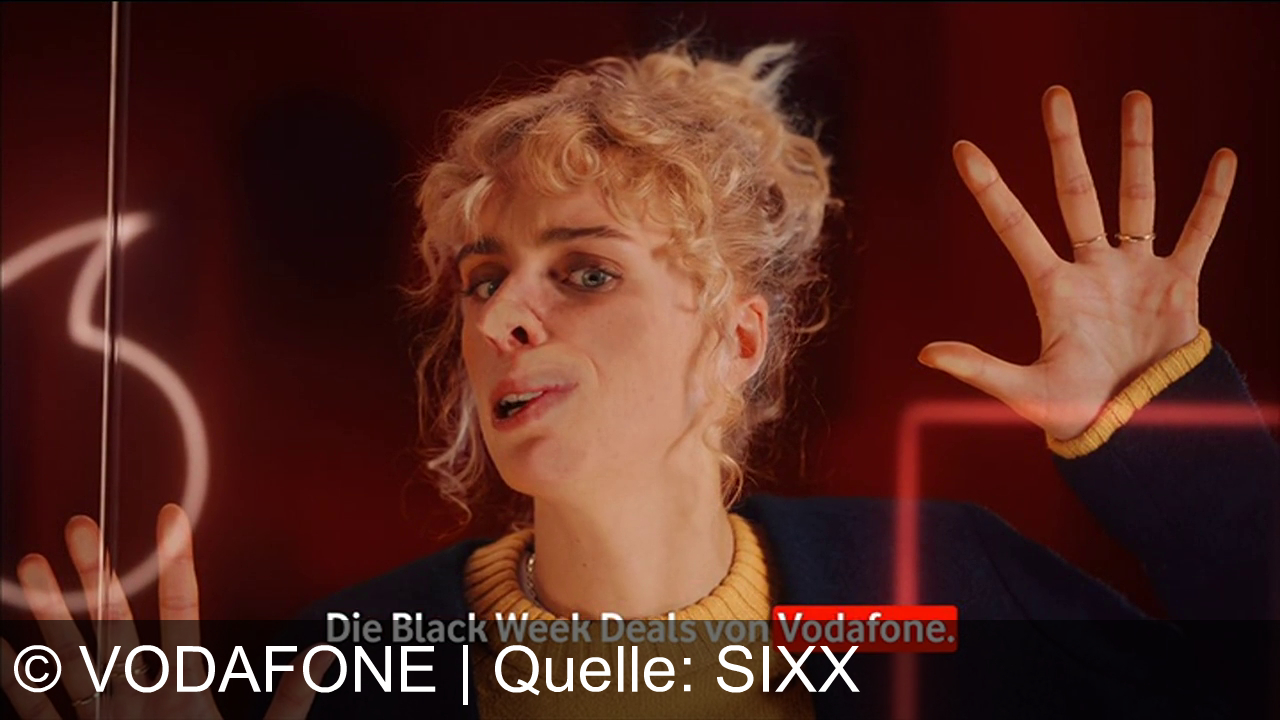 Eine Person mit lockigem Haar macht eine ausdrucksstarke Geste mit den Händen. Sie trägt einen gelben Pullover und eine dunkle Jacke. Im Hintergrund leuchtet ein rotes Lichtband. Unten steht der Text „Die Black Week Deals von Vodafone“ in weißer und roter Schrift auf schwarzem Hintergrund.