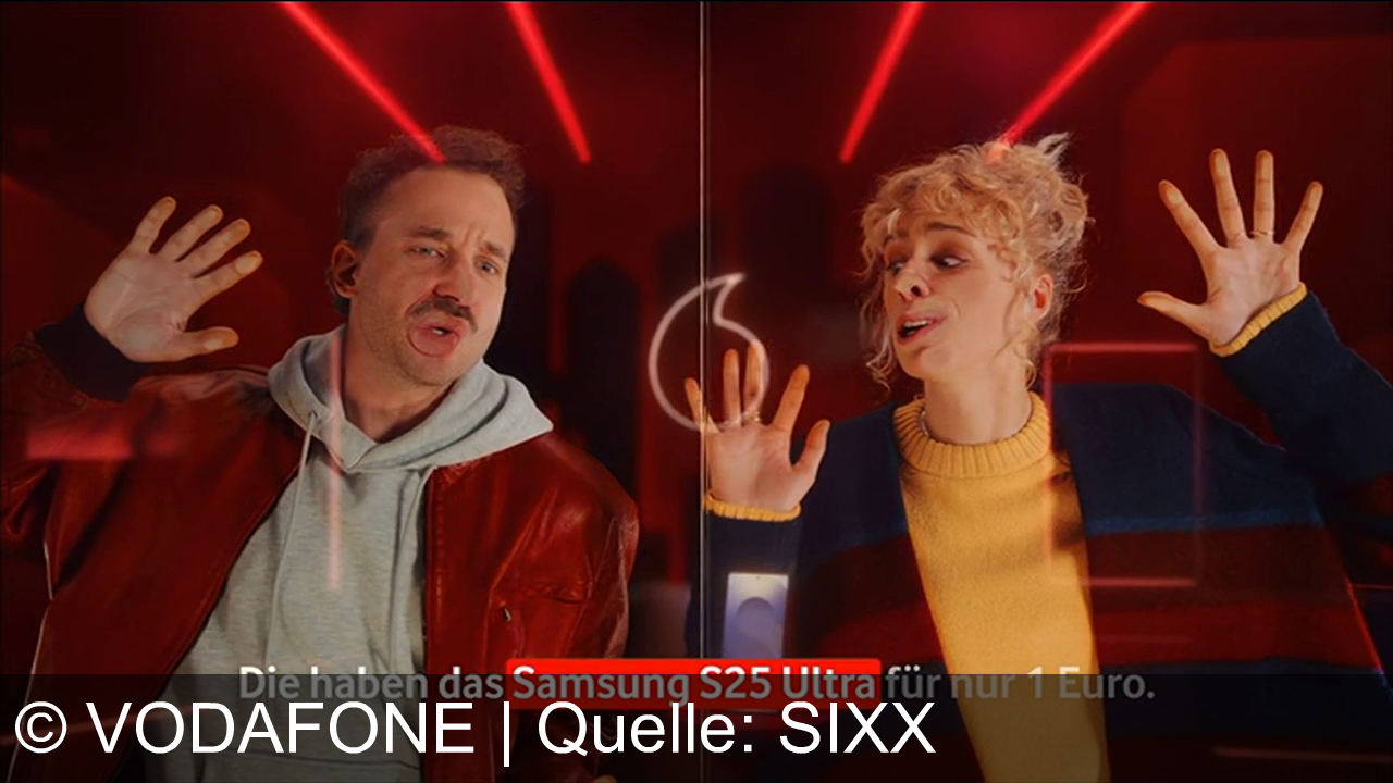 Zwei Personen in einem roten Raum mit leuchtenden Linien. Eine Person trägt eine braune Lederjacke und grauen Hoodie. Die andere Person hat lockige blonde Haare, trägt einen gelben Pullover und dunkelblaue Jacke. Beide haben Hände an Glaswand. Unter ihnen Text: "Die haben das Samsung S25 Ultra für nur 1 Euro." Im Hintergrund Vodafone-Logo.