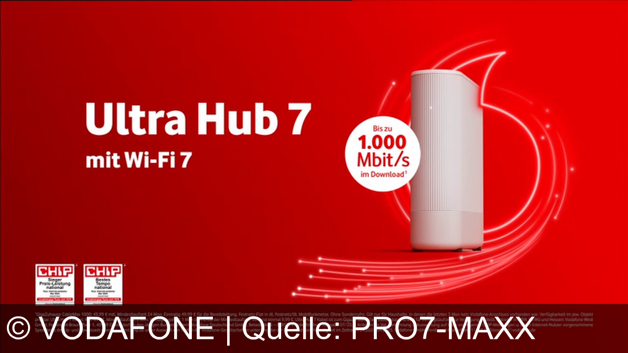 Werbung aus dem Jahr 2025 von Vodafone in Deutschland, mit dem von uns gewählten Titel: "Vodafone Ultra Hub 7: Stabiles Highspeed-Internet mit Wi-Fi 7 für Ihr Zuhause" mit der Kurzbeschreibung: "Mit Vodafone und dem neuen Ultra Hub 7 wird dein Zuhause zur Kino-, Gaming- und Zauberküche. Erlebe schnelle, stabile Power – bis zu 1000 Mbits im Download! Together we can.". Diese Werbung thematisiert oder beinhaltet die Kategorie/n Internetverträge-Dsl, Handy-Smartphone, Gaming, Streaming.