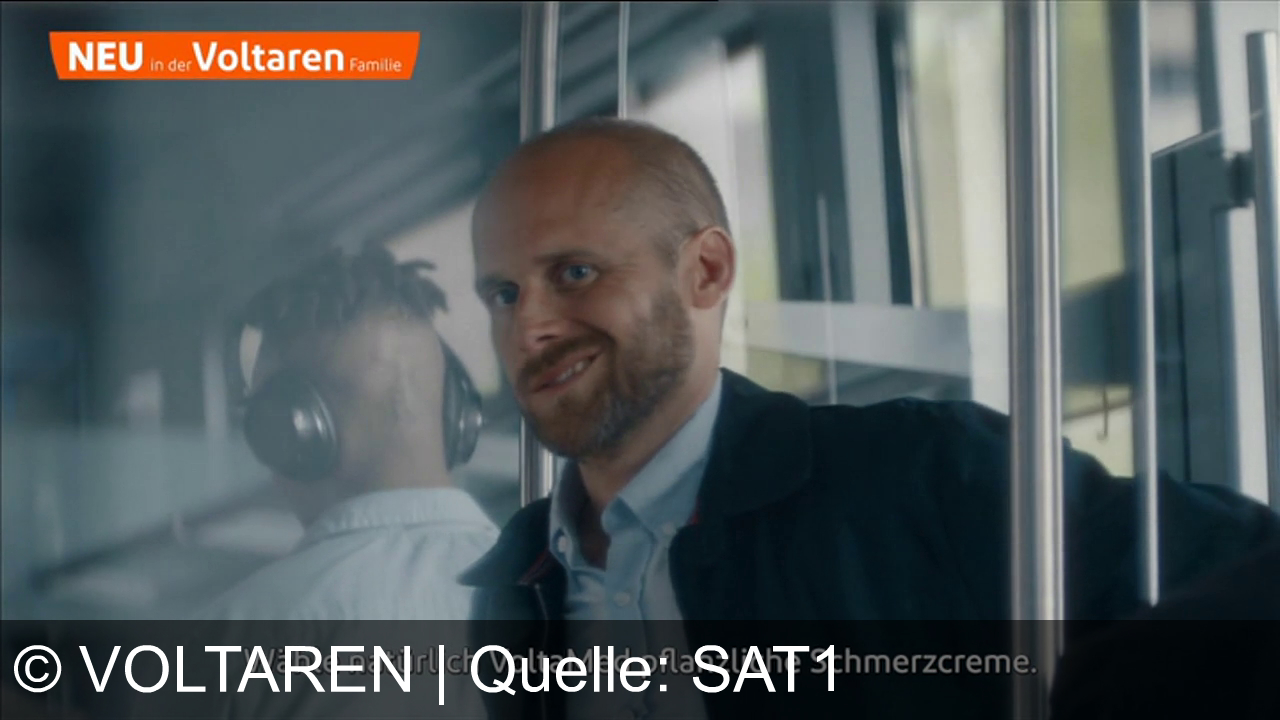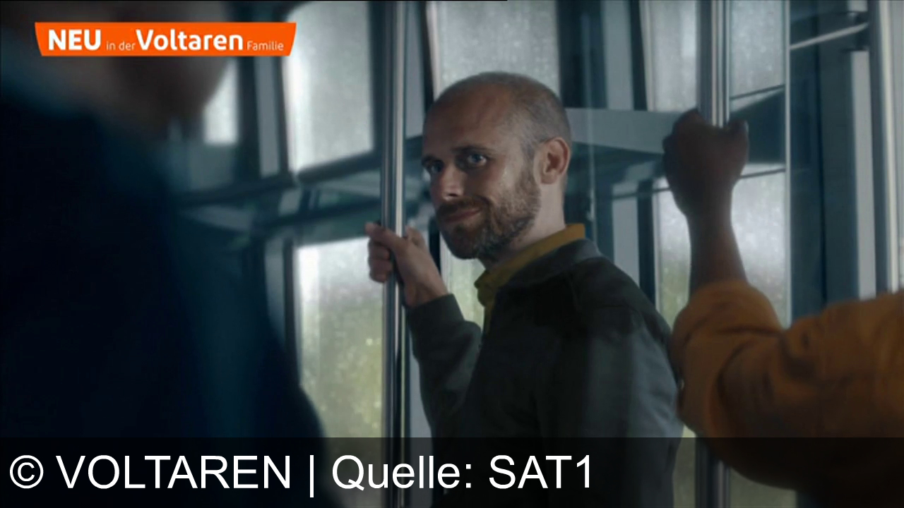 Ein Mann mit Bart hält sich an einer Stange fest und lächelt. Im Hintergrund sind Fensterscheiben zu sehen. Oben links steht in einem orangefarbenen Banner: "NEU in der Voltaren Familie". Zwei weitere Personen sind teilweise im Bild.