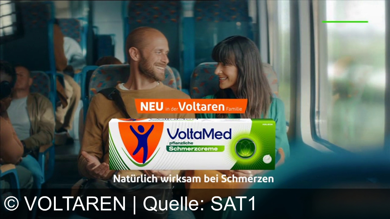Ein Mann und eine Frau sitzen lächelnd im Zug nebeneinander. Im Vordergrund ist eine Verpackung der VoltaMed pflanzlichen Schmerzcreme zu sehen. Ein Text sagt "NEU in der Voltaren Familie" und "Natürlich wirksam bei Schmerzen". Im Hintergrund sind weitere Fahrgäste zu erkennen.