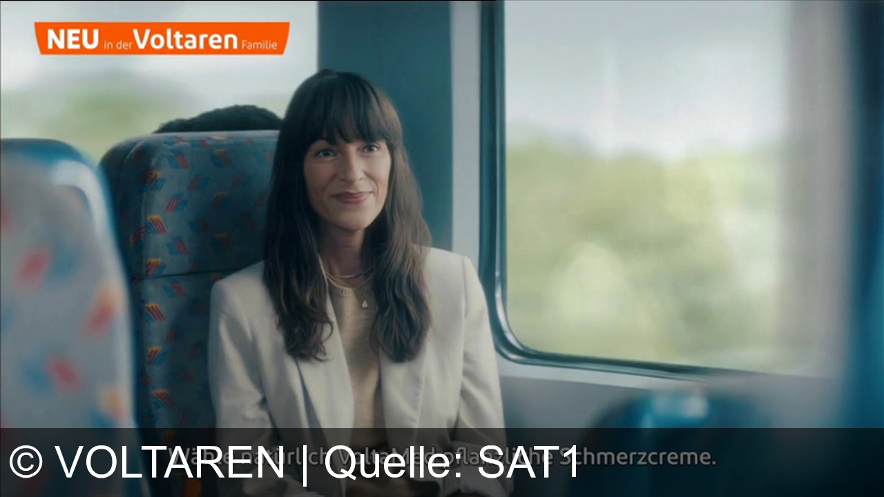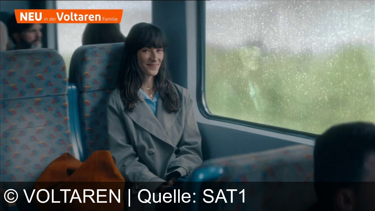 Ein lächelnde Frau sitzt in einem Zug, trägt einen grauen Mantel. Links neben ihr liegt eine orangefarbene Tasche. Im Hintergrund ist ein Mann mit Bart. Draußen regnet es, Fensterscheibe voller Tropfen. Oben links erscheint ein oranges Banner mit der Aufschrift "NEU in der Voltaren Familie".