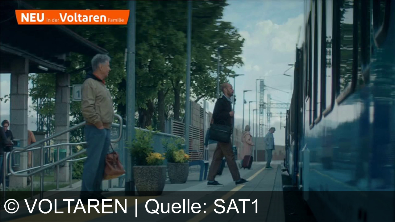 Ein Mann mit brauner Jacke steht auf einem Bahnsteig, hält eine braune Tasche. Rechts ein weiterer Mann mit einer Umhängetasche, läuft Richtung Zug. Zwei Personen mit Koffern weiter hinten. Links oben das Voltaren-Logo in Orange. Pflanzen neben dem Bahnsteig. Himmel leicht bewölkt, Gleise und Infrastruktur im Hintergrund.