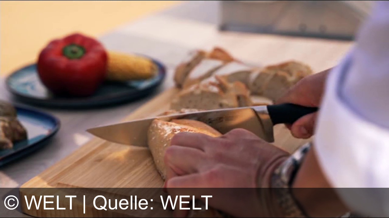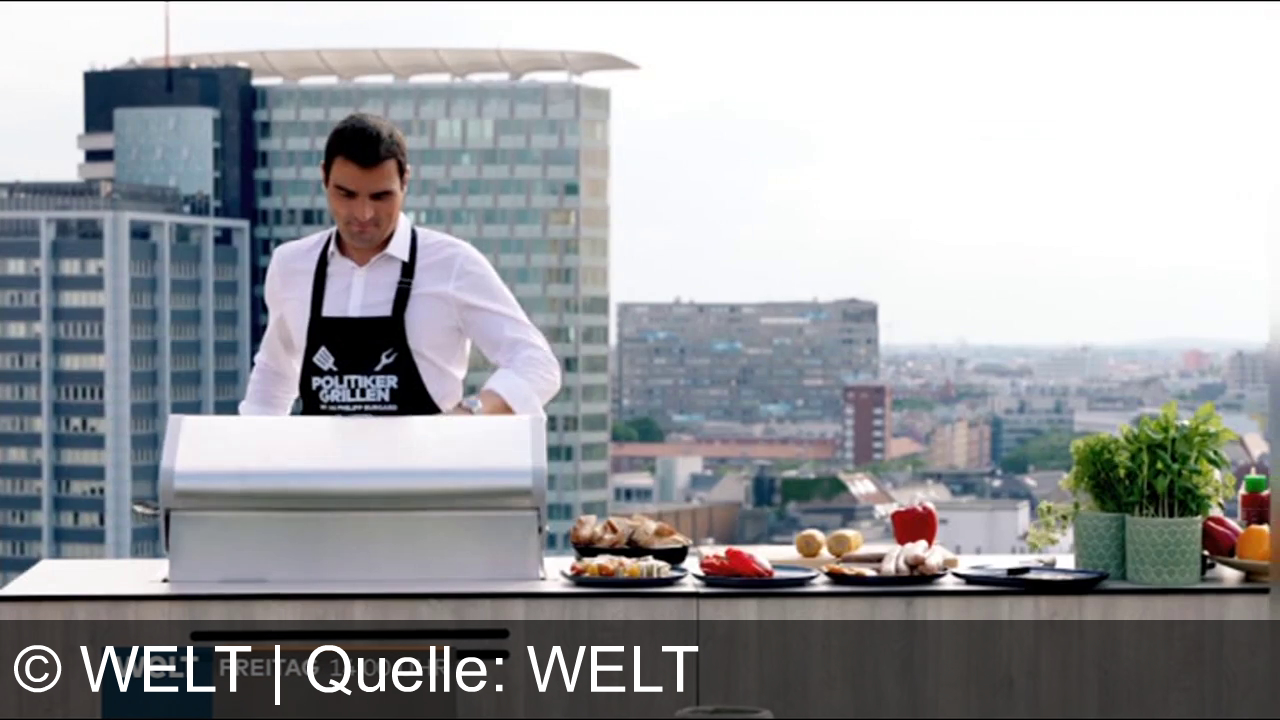 Ein Mann mit dunklen Haaren trägt eine schwarze Schürze mit der Aufschrift "Politiker Grillen" und steht an einem Grill auf einer Dachterrasse. Um ihn herum liegen Teller mit Essen und Kräutertöpfe. Im Hintergrund sind Hochhäuser und eine städtische Landschaft zu sehen. Unten links im Bild steht "WELT FREITAG 14:00 UHR".