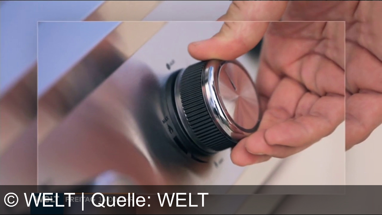 Eine Hand dreht an einem silbernen Drehknopf mit schwarzem Rand auf einem metallischen Gerät. Links unten steht "WELT FREITAG 14:00 UHR".