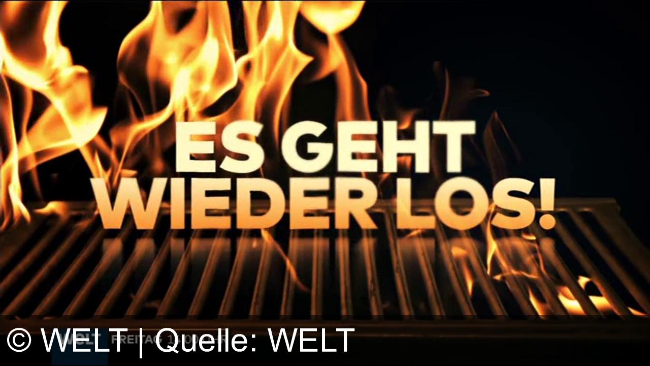 Flammen steigen über einem Grillrost auf. Der Text "ES GEHT WIEDER LOS!" steht groß im Vordergrund. Unten links das Logo von WELT, daneben der Hinweis "FREITAG 14:00 UHR".