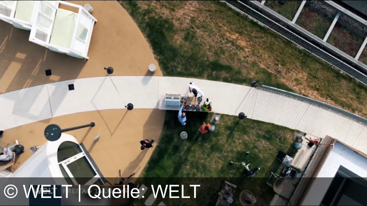 Eine Vogelperspektive zeigt einen Gehweg, umringt von Grasflächen und Gebäudestrukturen. Ein kleiner Tisch mit Personen und verschiedenen Gegenständen steht auf dem Rasen. Links oben liegen weiße Sonnenliegen. Der Schriftzug "WELT FREITAG 14:00 UHR" ist unten links sichtbar.