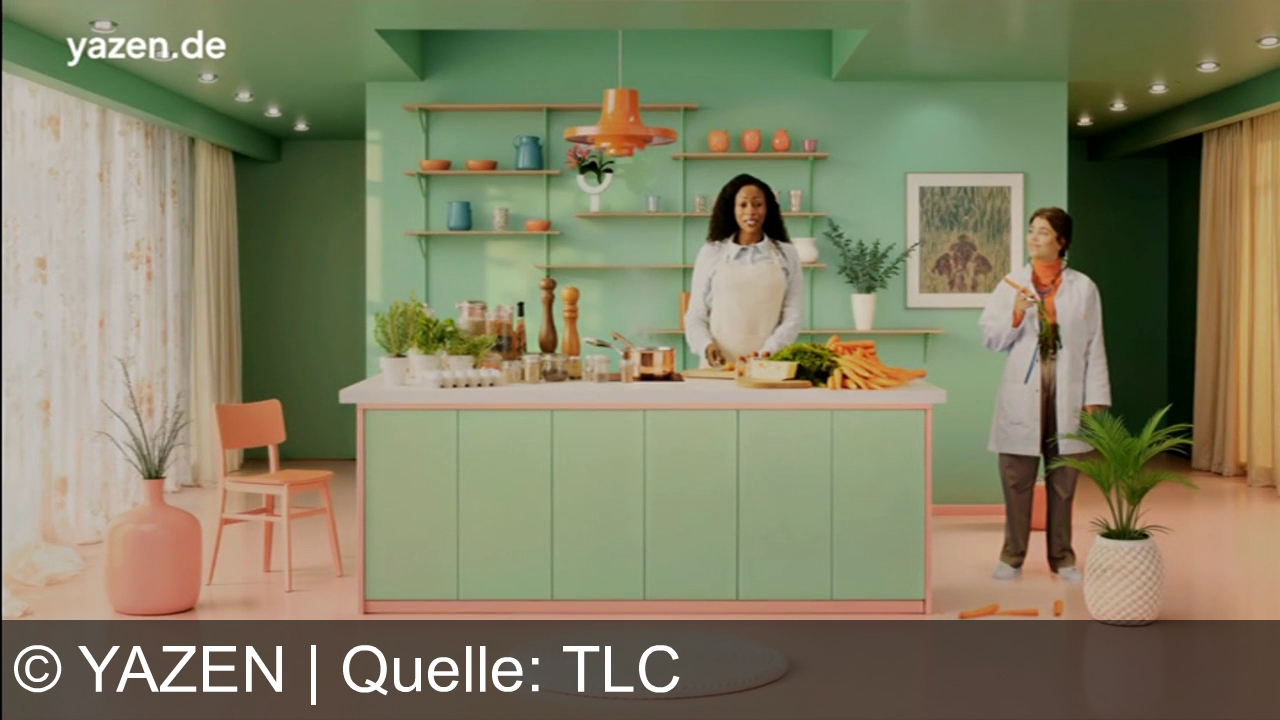 Eine Küche in Pastellfarben. Zwei Personen: eine in Schürze, die andere im weißen Kittel. Karotten auf der Theke. Grün-orange Einrichtung mit Regalen, Geschirr und Kräutern. Große Fenster mit Vorhängen links, Pflanze rechts. Teppich auf rosafarbenem Boden. Deckenlampen. Webseite "yazen.de" oben links.