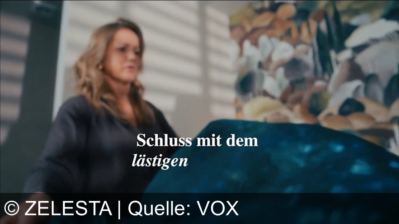 Eine Frau steht in einem Zimmer und hält ein blaues Tuch oder eine Decke vor sich. Im Hintergrund hängt ein buntes Bild an der Wand. Auf dem Bild steht der eingeblendete Text „Schluss mit dem lästigen“.