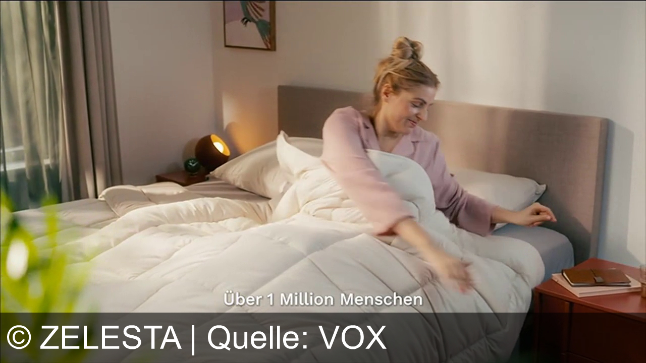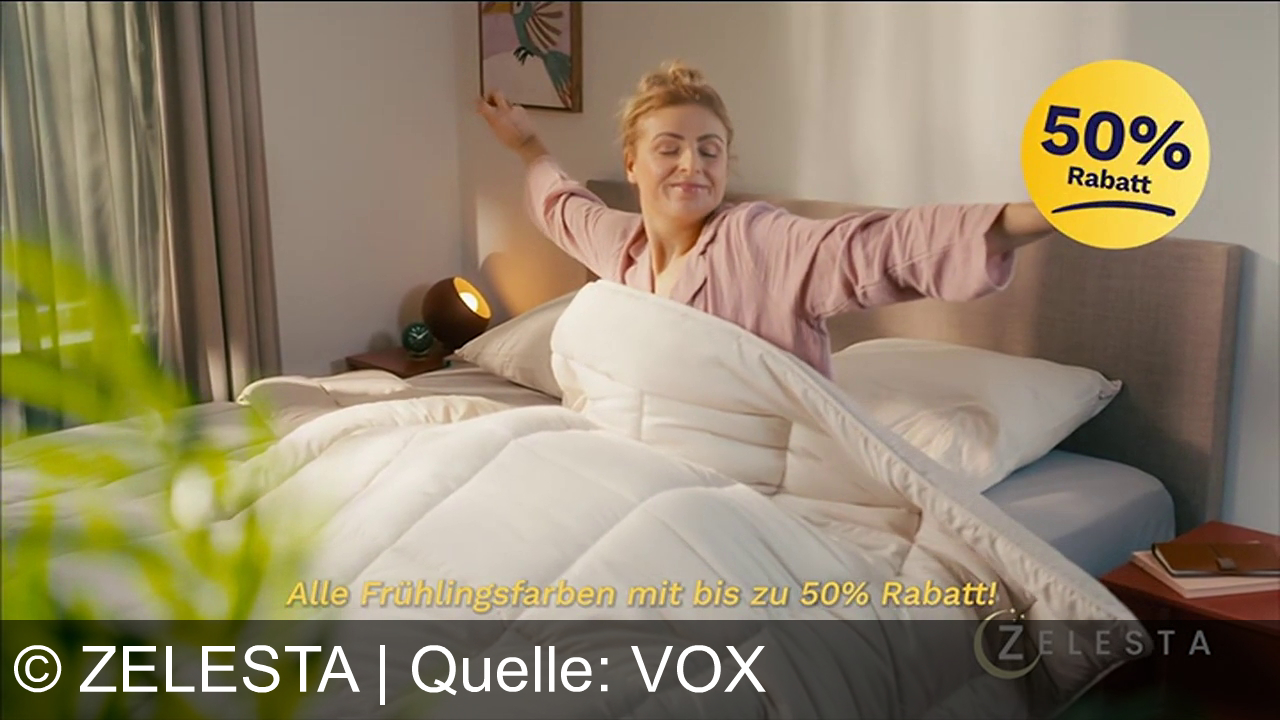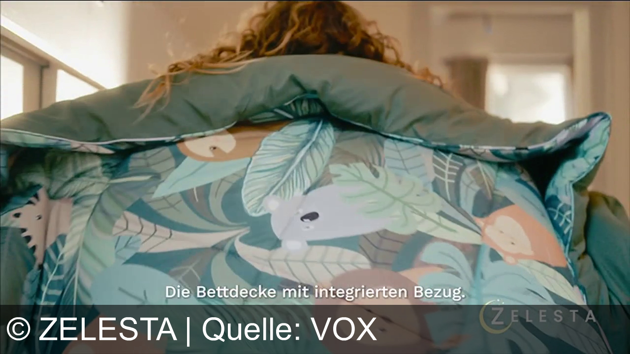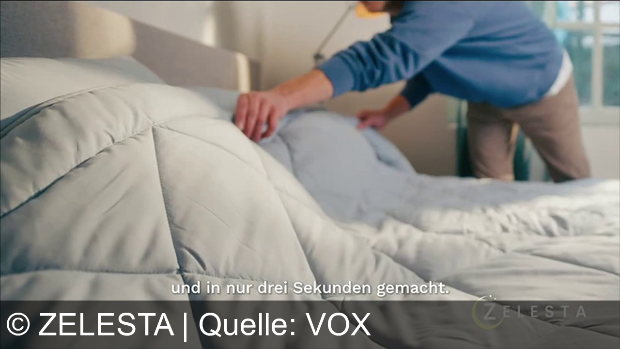 Zelesta bewirbt eine innovative, komplett maschinenwaschbare Bettdecke mit bereits integriertem Bezug. Die zentrale Werbeaussage verspricht das Ende des lästigen Beziehens und eine Zeitersparnis durch ein in drei Sekunden gemachtes Bett. Kunden können das Produkt 30 Nächte probeschlafen und beim Kauf aktueller Frühlingsfarben Rabatte nutzen.