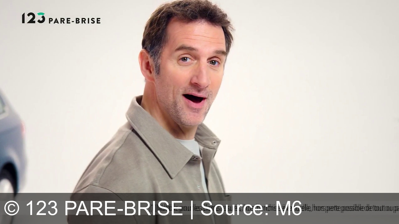 Un homme regarde la caméra avec un sourire tranquille devant un fond clair. Le logo d’une entreprise de pare-brise et une adresse web s’affichent à côté de lui. Des petites lignes de texte apparaissent en bas de l’image.