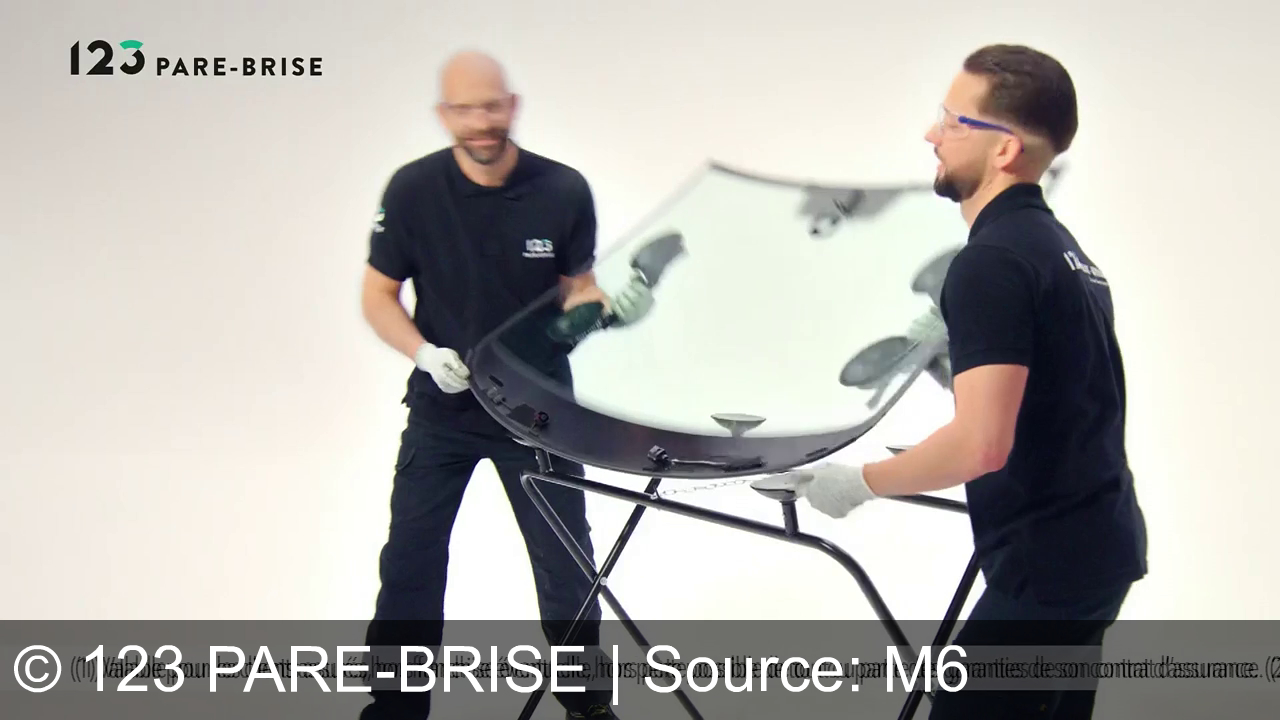 Deux gars en tenue pro tiennent un pare‑brise avec des ventouses et le posent sur un support métallique dans un studio tout blanc. Ils portent des gants et des vêtements noirs.