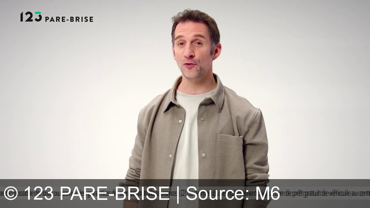 Un homme sourit face caméra avec une chemise beige, sur fond clair. Une voiture bleue apparaît sur la gauche. Le logo 123 Pare-Brise est en haut. Du texte fin est affiché en bas de l’image.