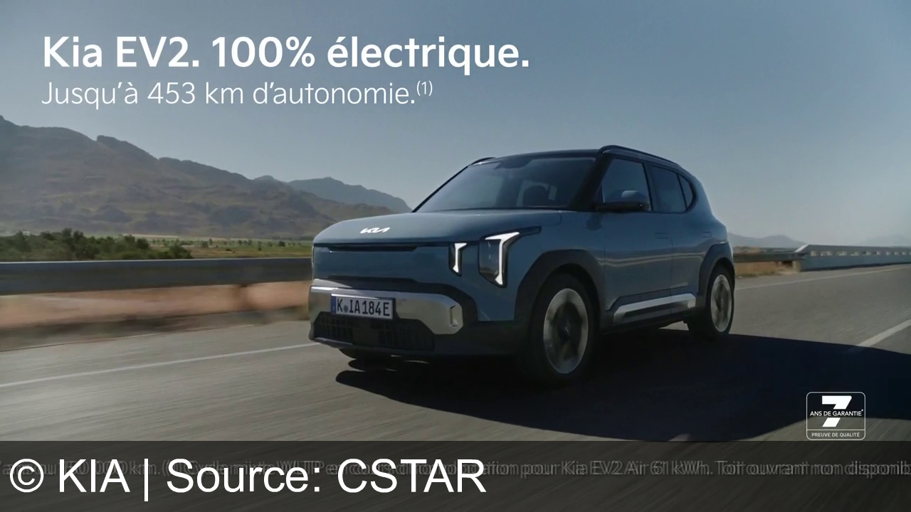 Publicité Kia de l'année 2026 en France, avec le titre que nous avons choisi : "Kia EV2 : Le SUV compact qui rend l'électrique simple et inspirant." et la brève description : "Kia EV2 : votre première électrique avec 453 km d'autonomie. Du mouvement vient l'inspiration.". Cette publicité traite ou inclut la/les catégorie(s) Voiture Électrique, Automobile, Location‑financement, Essai Routier.