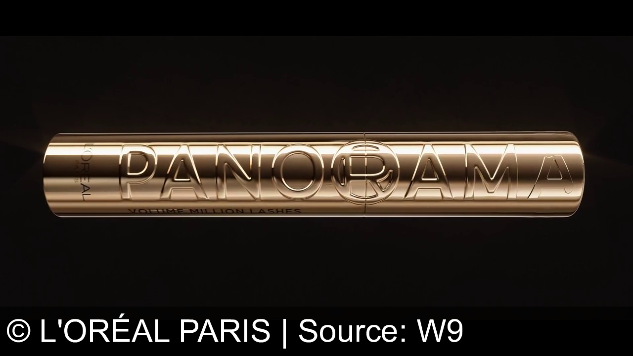 Un tube de mascara doré apparaît en gros plan sur fond noir, avec le mot PANORAMA gravé dessus et la mention Volume Million Lashes de L’Oréal Paris.