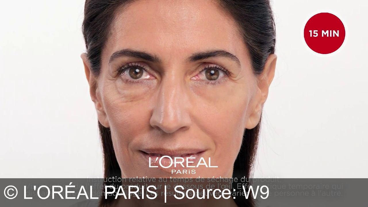 Gros plan sur le visage d’une femme face caméra, lumière blanche, expression neutre. Un cercle rouge avec “15 MIN” apparaît à droite. Le logo d’une marque de cosmétique est posé en bas avec du texte fin.
