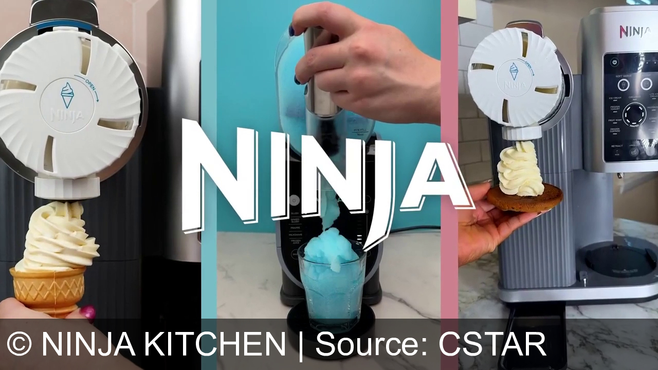 Une machine sort de la glace soft, d’un côté dans un cornet, de l’autre sur un cookie. Au milieu, une autre machine balance une glace bleue dans un verre. Le mot NINJA est affiché en grand par-dessus les images.