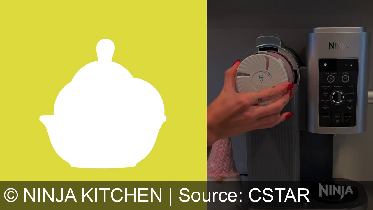 Une main avec ongles rouges met un récipient rond dans une machine à glace Ninja. À gauche, un fond jaune montre une silhouette blanche en forme de bol.