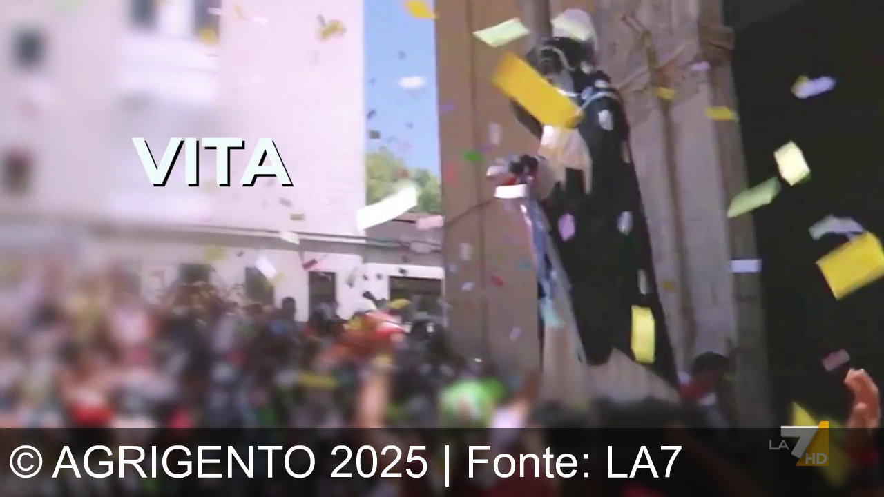 Una folla di persone si vede sfocata mentre affollano una piazza. Carta colorata e coriandoli sono in aria, una persona vestita da monaco con un microfono si trova su un palco. A sinistra della scena, la scritta "VITA". Nella parte inferiore a destra, il logo del canale LA7 HD.