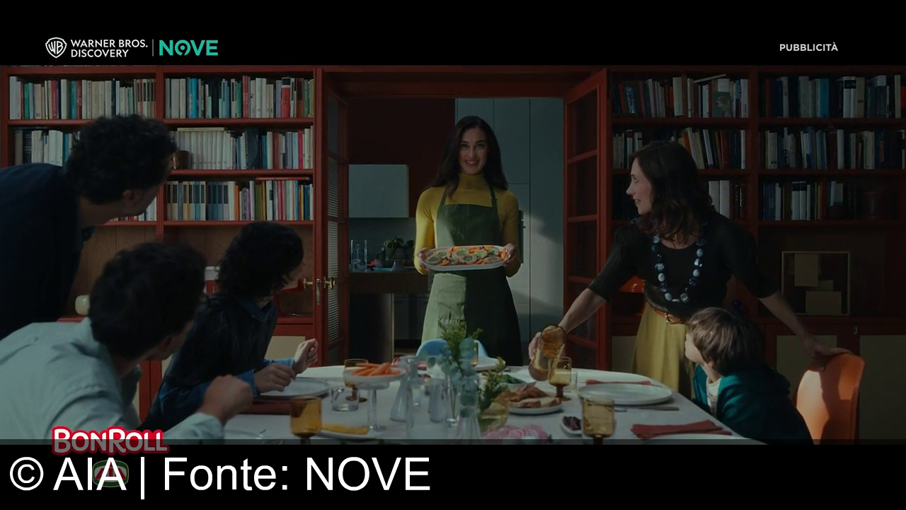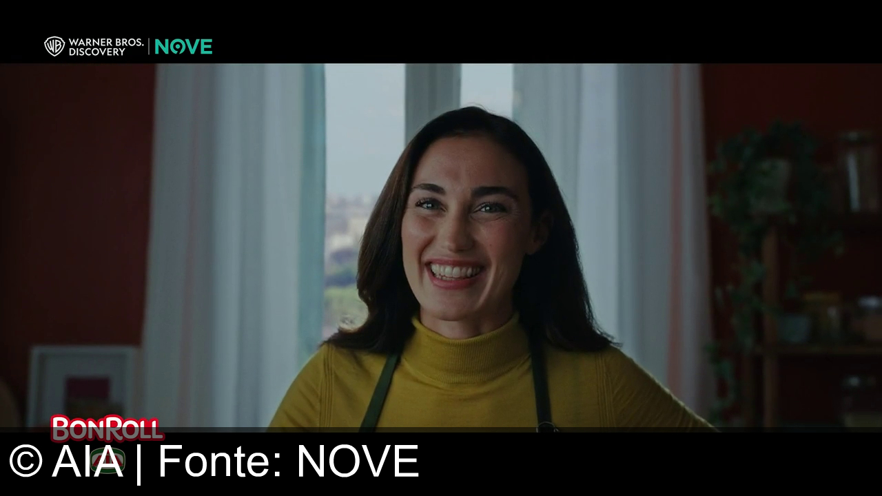 Una donna sorride mentre tiene una forchetta. Indossa un maglione giallo. Sullo sfondo, uno scaffale con libri e oggetti vari. Nella parte superiore dello schermo, i loghi di Warner Bros. Discovery e NOVE. In basso a sinistra, il logo "BonRoll AIA".