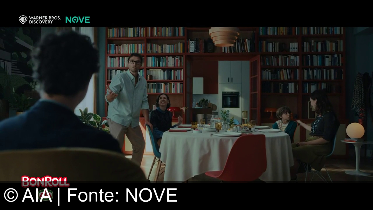 Una stanza luminosa con una libreria piena di libri. Tavolo rotondo apparecchiato, intorno alcune persone sedute. Un uomo in piedi, una donna ride. Sullo schermo scritte: "Warner Bros. Discovery," "NOVE," "BONROLL," "AIA". Ai lati del tavolo ci sono piante e oggetti decorativi. Ambiente accogliente e sereno.