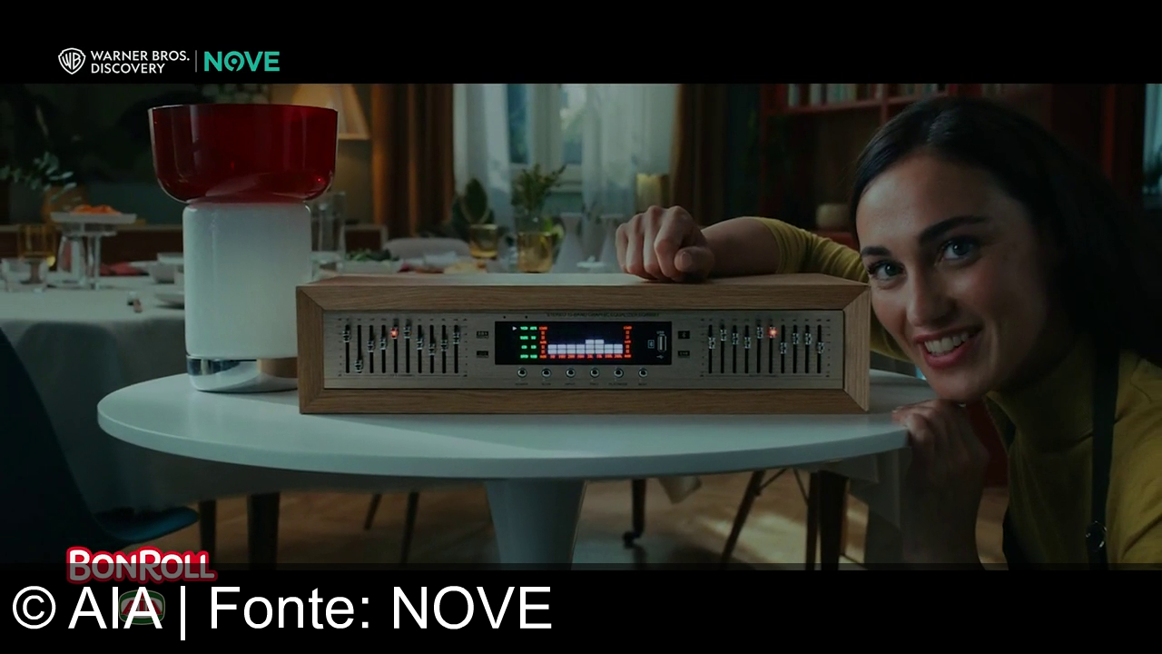 Una donna sorride e fa capolino accanto a un equalizzatore posizionato su un tavolo bianco. Sul tavolo, oltre al dispositivo, c'è una lampada dal design moderno con una base bianca e un paralume rosso. Sullo sfondo, una tavola apparecchiata con piatti e bicchieri. In alto a sinistra, i loghi di Warner Bros. Discovery e NOVE, in basso a sinistra il logo BonRoll AIA.