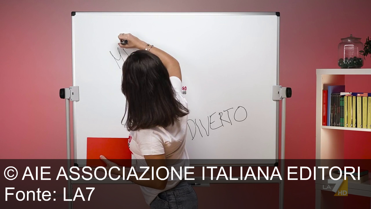 Una donna scrive su una lavagna bianca con un pennarello nero. Indossa una maglietta bianca e jeans. Tiene un quaderno rosso in mano. Dietro, una parete rossa e una libreria con libri. Sulla lavagna ci sono scritte le parole "MUOVO" e "DIVERTO". In basso a destra, il logo "LA 7 HD".