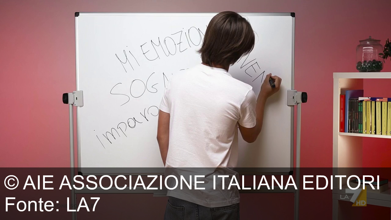 Un ragazzo sta scrivendo su una lavagna bianca. Indossa una maglietta bianca e jeans. Sulla lavagna ci sono parole scritte come "sogni" e "imparo". Il muro dietro è rosa. Accanto alla lavagna c'è una libreria con libri colorati e un barattolo con delle biglie. Nell'angolo in basso a destra c'è il logo "LA7 HD".